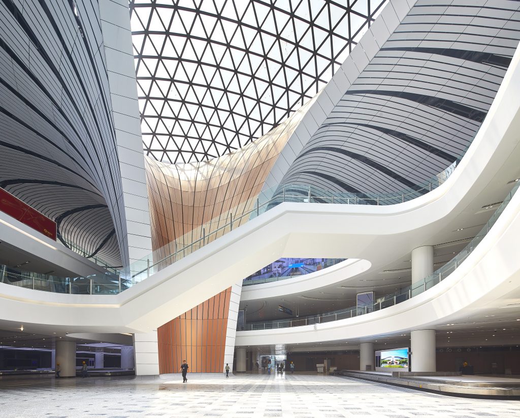 The new star-shaped terminal at Beijing Daxing covers 6,620 acres, the largest single-building airport terminal in the world. Arranged around the main courtyard space, Zaha Hadid Architects has created a series of flowing forms that support the roof and act as skylights to bring light into the space.The four-storey airport is arranged around this central space, which is naturally lit with a glass roof that the studio refers to as a “central orientation space domeOther construction projects within the airport include airline bases, an intercity railway, high-speed subway station, access highways, and an air traffic control tower.