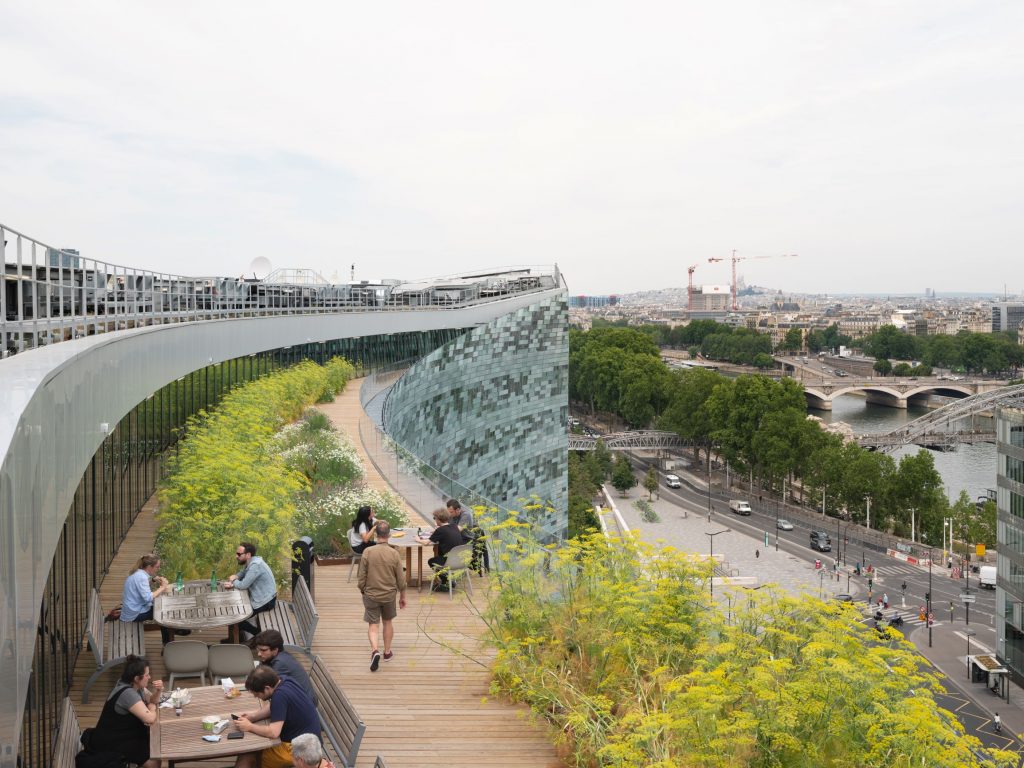 Visitors to the building are greeted by a broad public plaza with integrated vegetation. The plaza invites passersby to linger and interact while also creating connections to the city streets on each side of the building. During 2021 this physical connection will be enhanced with the introduction of a new bridge that will span across the neighboring rail tracks of Gare d’Austerlitz. (Austerlitz Rail Station).